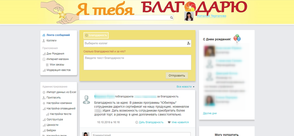 Наталья: Мы зафиксировали курс: 1 благодарность = 100 рублей. Переименовали программу в «Я тебя благодарю». В Лавке все призы заменили на сертификаты на 100, 200, 300 рублей. И ввели ограничение, что в месяц можно выдать только ДВЕ благодарности. И запустили обновленный сценарий в народ.