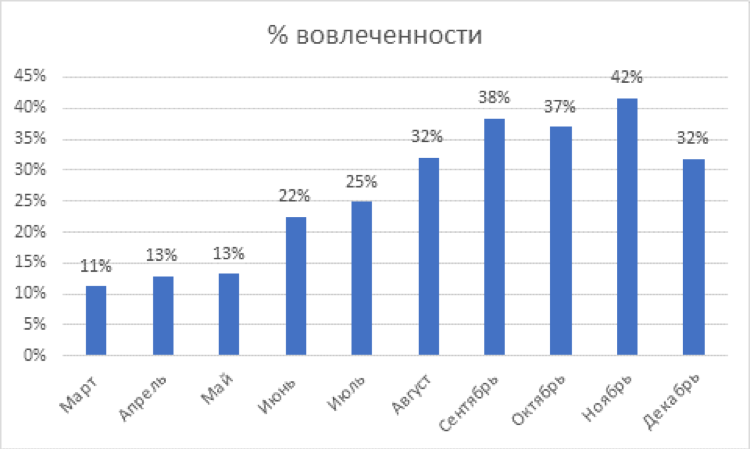 В общем, 2017-ый год мы прожили не просто, но зато посчитали динамику активности сотрудников по раздаче благодарностей — пик был в ноябре, 42% сотрудников раздали свои пряники.