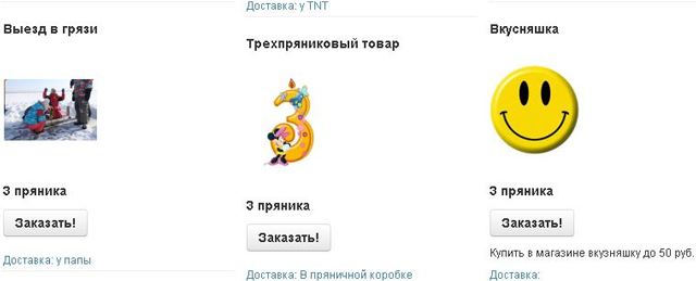 Денис: Сначала я добавлял отдельные товары, но энтузиазм и фантазия как-то быстро кончились — в итоге придумал одно-, двух-, трех- и т. д. пряниковый товар: всякие приятности из магазина fix-price, которые стоят недорого, а детям в радость. Я эти штуки покупаю, надписываю и складываю в специальную оформленную дочкой коробку. Есть еще товар «Выезд в грязи» =3 пряника, когда дети могут поехать в специально-детский выезд — назначаем время, и публикуем на местном форуме: «в 12:00 вскр выезд на лед».