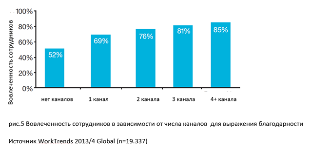 Институт разумных кадровых ресурсов (SWI) выпустил отчёт, показывающий важность использования нескольких каналов связи для признания заслуг сотрудников. Доклад основан на опросе 19000 работников из 26 стран и показывает реальную силу этого явления. Чем больше каналов связи мы используем, чтобы признавать заслуги работников, тем лучше мы можем с ними общаться и благодарить их. Это приводит к повышению активности и удержанию работников в компании.