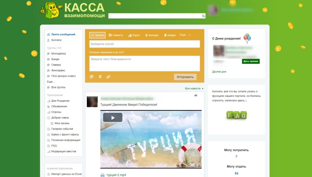 Екатерина: За 1,5 месяца до старта мы запустили серию «интригующих» рассылок. В них Кассёнок по капле приоткрывал завесу того, что должно произойти с запуском сети. Ко дню запуска мы сделали промо-ролик о компании и «инструктажный» ролик об использовании сети. И когда разослали эти ролики и приглашение в сеть, то народ уже был «подогрет», активность на старте сразу была высокой. Потом, конечно, снизилась, но мы постоянно работаем над ее поддержанием: через интересные публикации, через конкурсы, промоутировали сеть по другим каналам — писали в мессенджерах, например, мол, смотрите, вот какая активная группа в таком-то регионе, как у них все здорово. Хочется придумать какой-то способ автоматически напоминать сотрудникам о сети, стимулировать их туда заходить… Может, даже начислять валюту за заходы или за активности. Мы еще думаем.