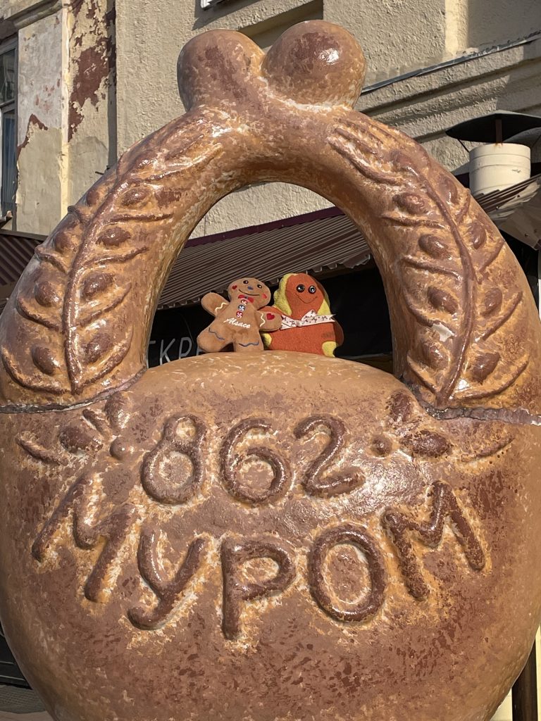 Первым делом мы посетили город Муром. В Муроме Пряники познакомились с муромским калачом. Кстати на гербе города их целых три штуки. Говорят, так вышло, потому что однажды императрица Екатерина пила чай с калачом, а на вопрос министров о том, что на герб поместить, сказала, мол, калач дюже вкусный — кидайте три.