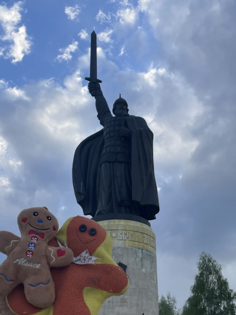 Также в городе довелось познакомиться с Петром и Февронией. Вы наверняка знаете их историю. За спинами их сидел заяц, который прыгал у Февронии по горнице. Оказалось, что тереть на счастье надо именно зайца, а вовсе не легендарную пару. В конце нашего путешествия по Мурому, на набережной, Пряники наблюдали статую Ильи Муромца, который по легендам тоже был реальным персонажем.