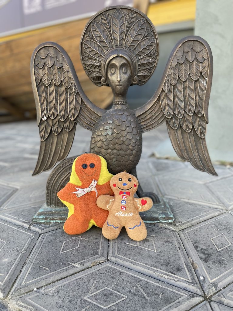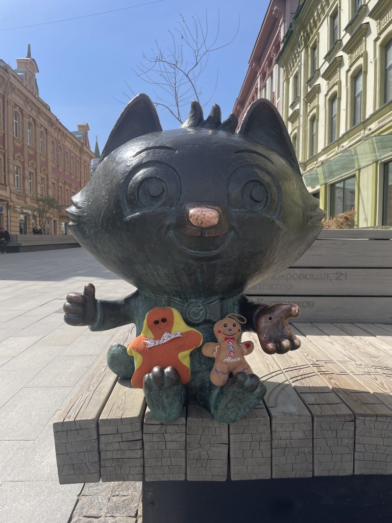 Дальше дорога привела нас в Нижний Новгород. Там мы нажелали себе стабильности и благополучия, и посидели на коленях у статуи сбер-кота. Нашли своего сородича, и конечно же сфоткались с этим местным братом по разуму.