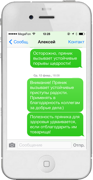 В-третьих, мы сделали рассылку SMS по сотрудникам — и каждый получил в течение недели несколько намеков-подсказок о том, что можно сделать с пряниками.