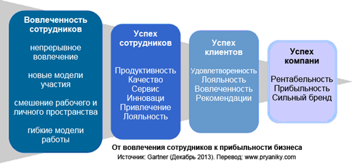 Акцент на вовлеченности имеет решающее значение, ведь связь между вовлеченностью и производительностью бизнеса уже убедительно доказана (см. «CFO Advisory: Employee Engagement Impacts Finncial Outcomes and Business Risk»). Проведенный в феврале 2013 года среди 1,3 млн. сотрудников, анализ Gallup показал, что компании, попавшие в верхний квартиль по уровню вовлеченности, имеют следующие преимущества по сравнению с теми, кто оказался в нижнем квартиле: